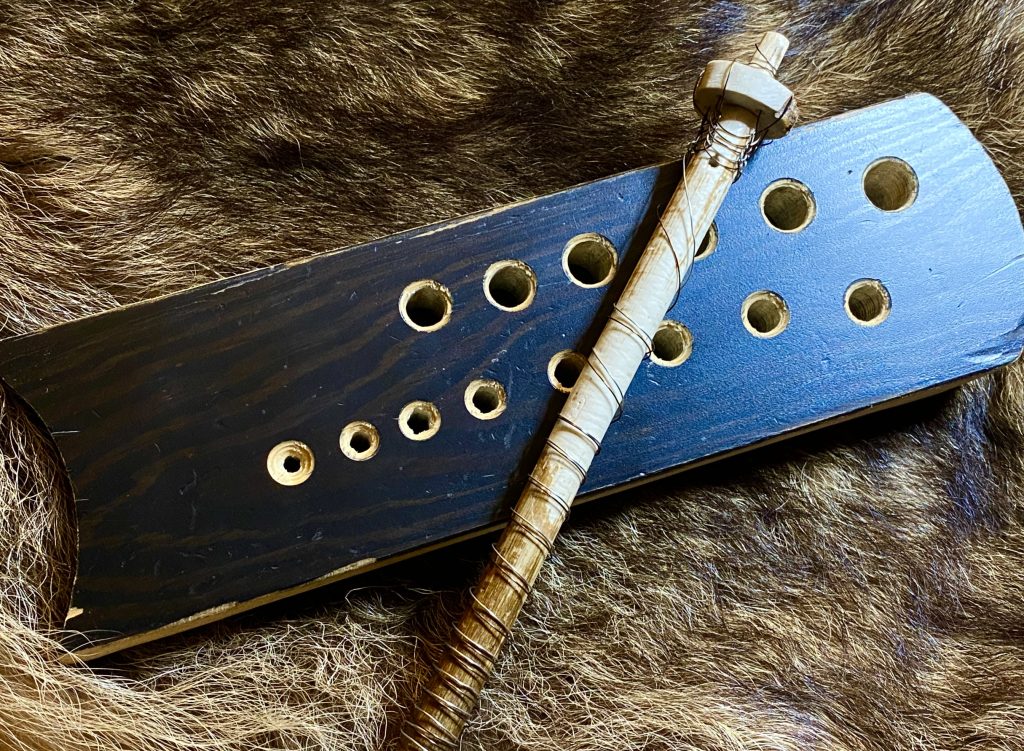 Das Ziehholz oder Zugbrett dient dazu, die geflochtene Kette zu komprimieren und in die gewünschte Form zu bringen. Es hat Löcher in verschiedenen Durchmessern.