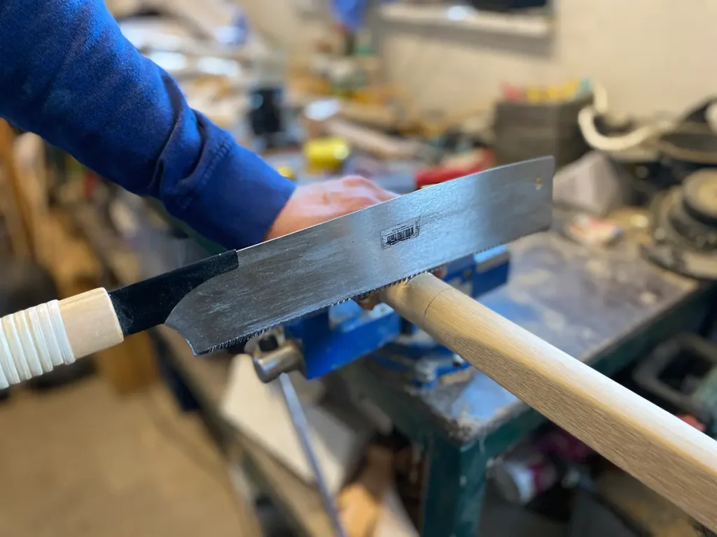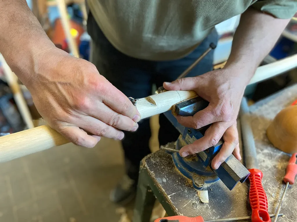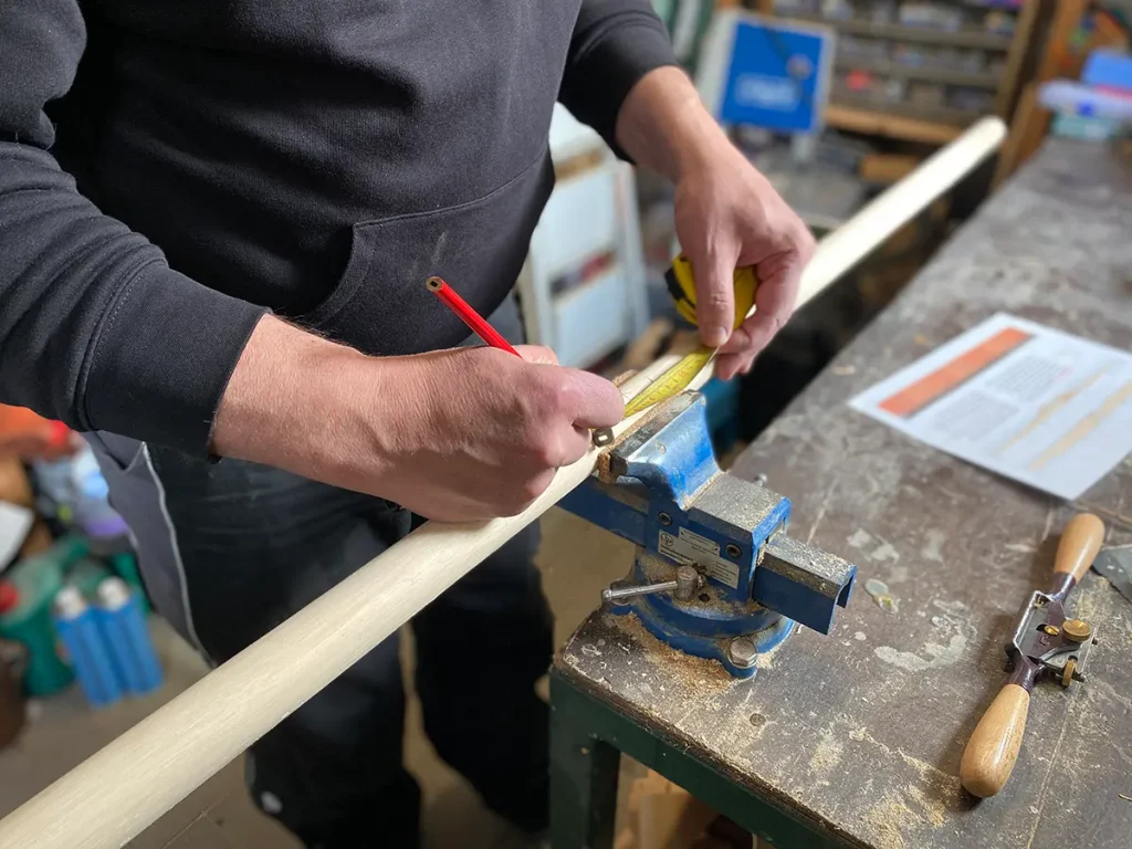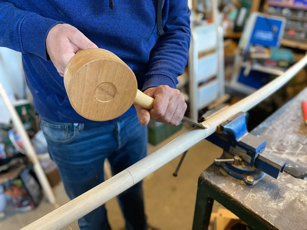 Es begann mit dem Zuschnitt des Materials. Jedes Stück Rattan (auch bekannt als Manau) wurde individuell der Körpergröße des jeweiligen Schützen angepasst. Als nächstes wurde die Form des Bogens präzise angezeichnet und mit Japansäge, Ziehhobel, Zieheisen und Feilen ausgearbeitet. So wurde der Rohling mit viel Handarbeit in die Form eines Langbogens gebracht.