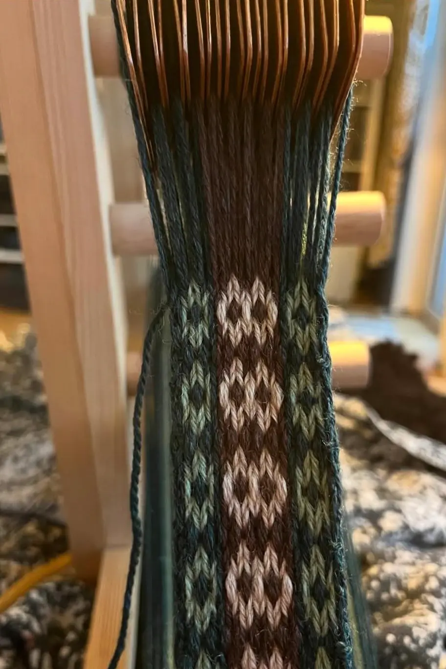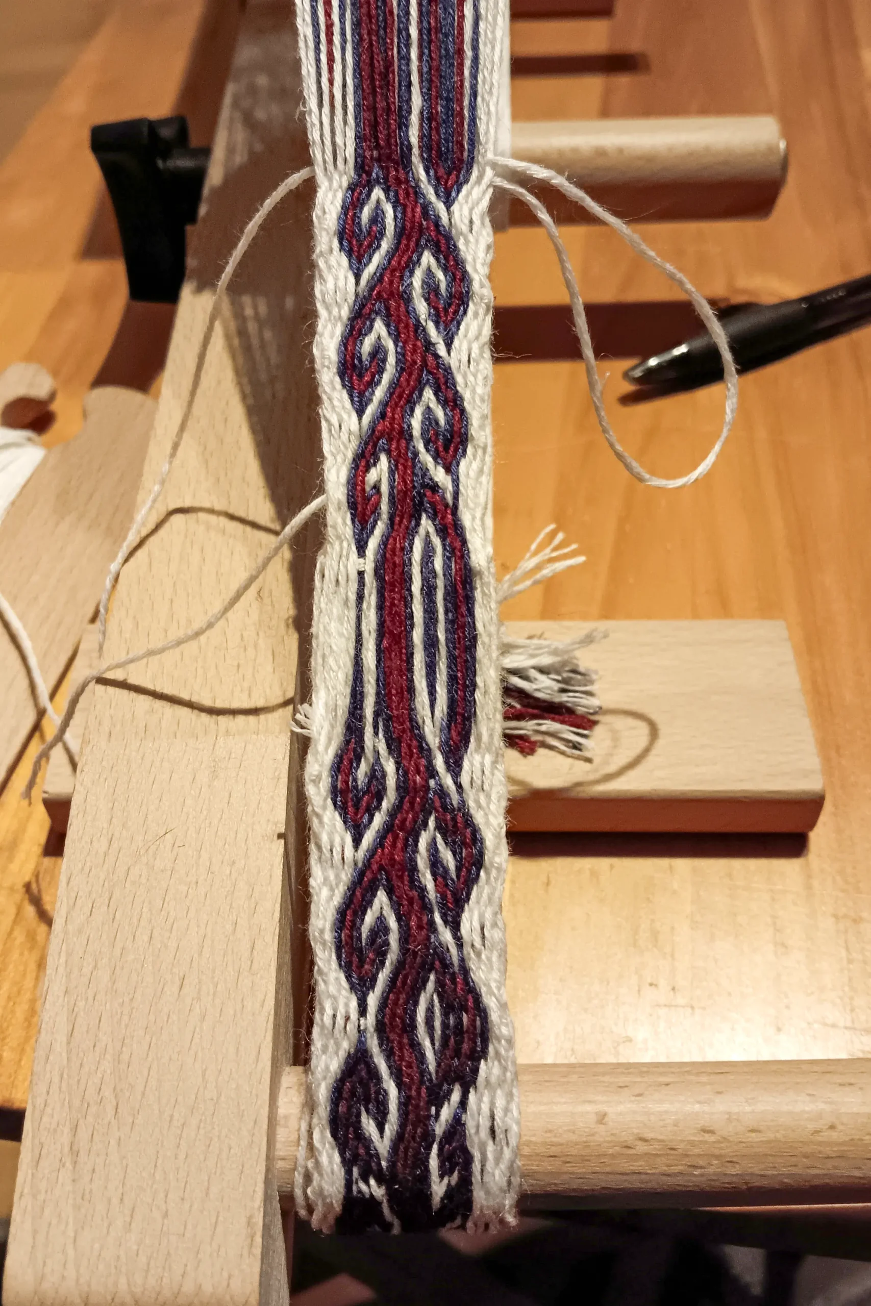 Das Muster entsteht durch das Aufschären der verschiedenfarbigen Kettfäden und die Drehung der Brettchen. Außerdem kommt es darauf an, in welcher Richtung die Fäden geschärt werden. Das heißt, in welcher Richtung die Fäden durch die Brettchen gezogen werden. All dies wird vorab festgelegt und im Schärbrief dokumentiert.